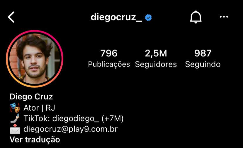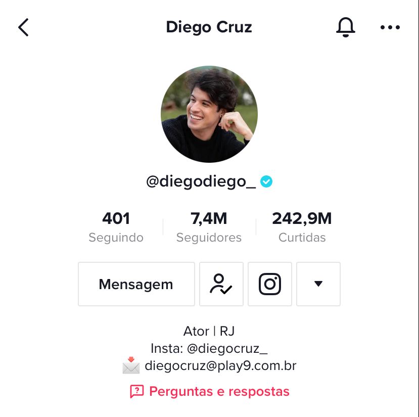Outro tiktoker bastante conhecido é o Diego Cruz, de 27 anos, atualmente com 7,4 milhões de seguidores. Ele é ator e cantor, no aplicativo é conhecido pela sua interpretação, principalmente com imitações de professoras e mães, além de encenar cenas clichês de filmes, séries e situações cotidianas.