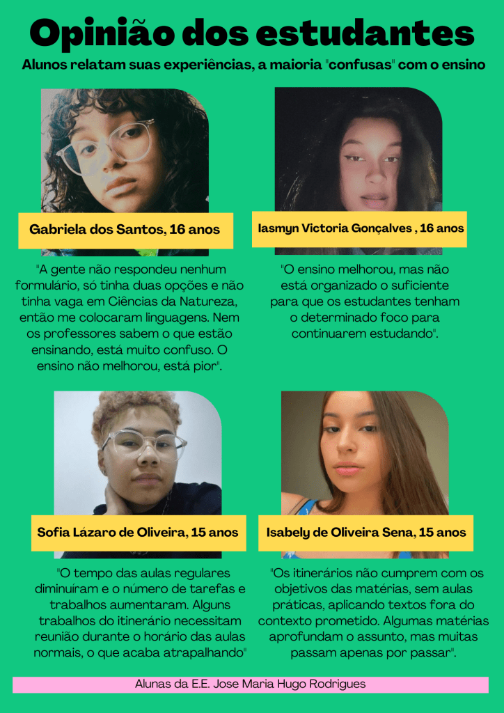 Cursando o itinerário de humanas, Sofia Moreira Lázaro de Oliveira, de 15 anos, afirma que não escolheu na matrícula sua opção e o ensino está pior, pois os professores estão cansados, e ensino “bagunçado” que não conversa com as disciplinas regulares.