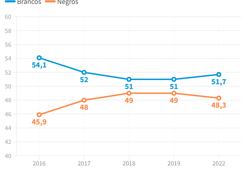 A pesquisa mostra que no período de 2016 a 2019 houve um aumento na proporção de pretos e pardos nas universidades, passando de 45,9% para 49% respectivamente, um total de 3,6 milhões de pessoas em relação ao total de matriculados. No entanto, depois de três anos sem a pesquisa devido à pandemia da Covid-19, os dados de 2022 mostram uma queda para 48,3%. O Brasil passou a ter 4,1 milhões de estudantes, em comparação com o total 8,2 milhões de estudantes.