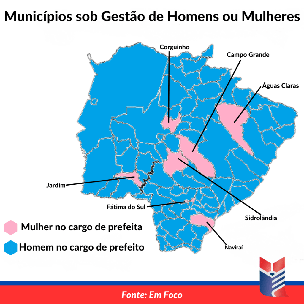 Entre as sete cidades com liderança feminina, ressaltam-se casos como o de Campo Grande, onde Adriane Lopes(PP) assume o papel de prefeita; Sidrolândia, governada por Vanda Cristina Camilo (PP); Jardim, sob a gestão de Cleidiane Areco (DEMOCRATAS); Naviraí, comandada por Rhaiza Matos (PSDB); Fátima do Sul, sob o governo de Ilda Machado (PSD); Águas Claras, liderada por Gerolina Alves (PSD), e Corguinho, com a prefeita eleita Marcela Ribeiro Lopes (PSDB).